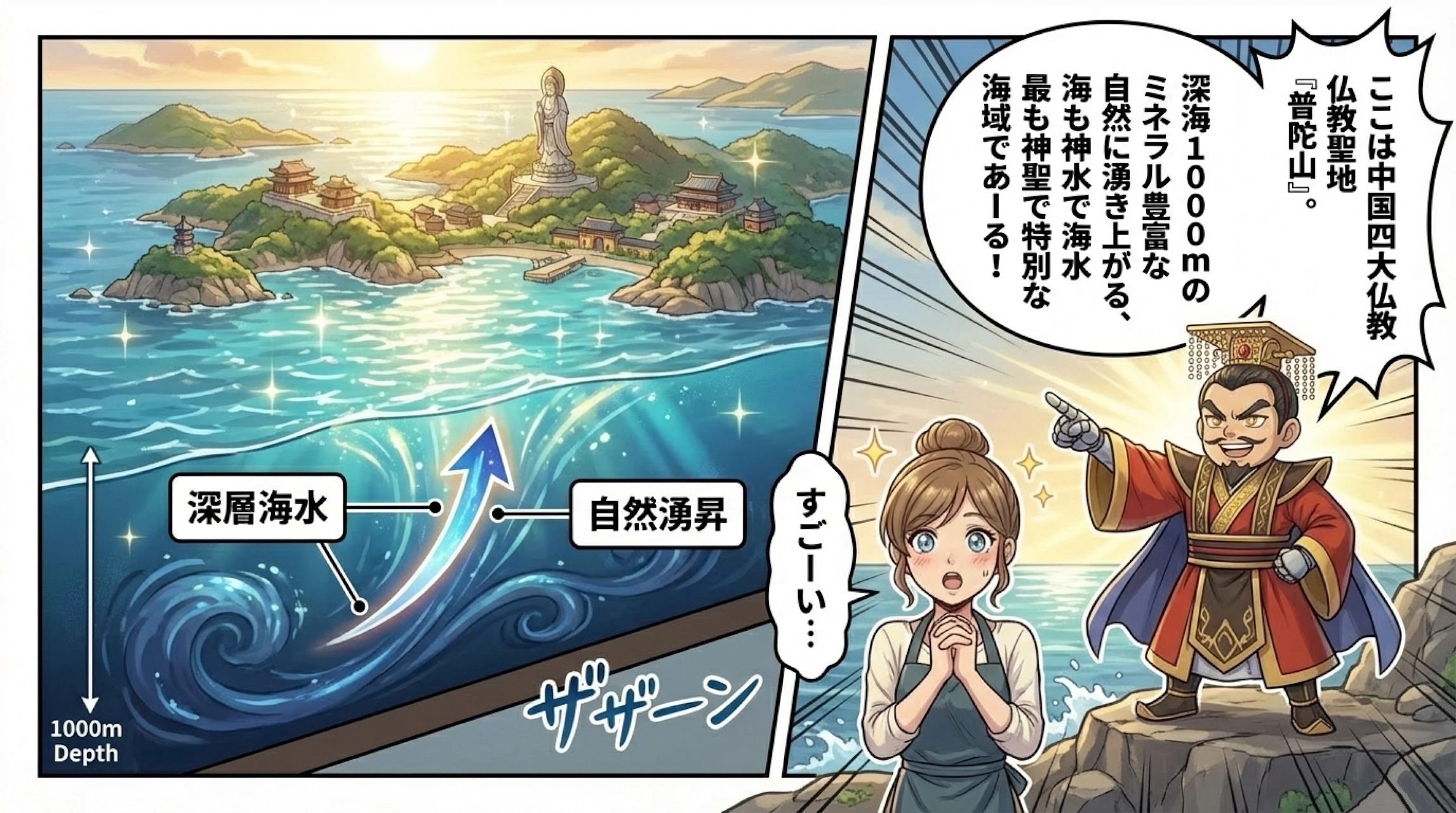 皇帝塩の産地は中国・浙江省舟山群島です。同じ中国産天日塩でも産地によって海の性質は大きく異なります。浙江省の海域は深層海水が自然に湧き上がる特別な環境で、深海のミネラルが豊富に含まれています。舟山群島には中国四大仏教聖地「普陀山」があり、一般人が立ち入れない神聖な塩田でのみ皇帝塩は造られています。