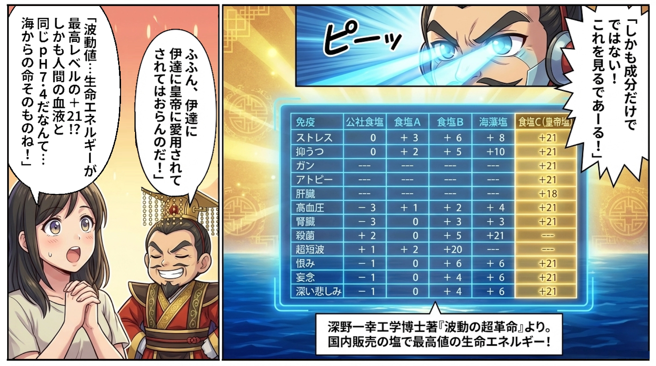 書籍『波動の超革命』(深野一幸工学博士著)の中で、皇帝塩は国内で流通している塩の中で波動値が飛び抜けて高いと公表されています。