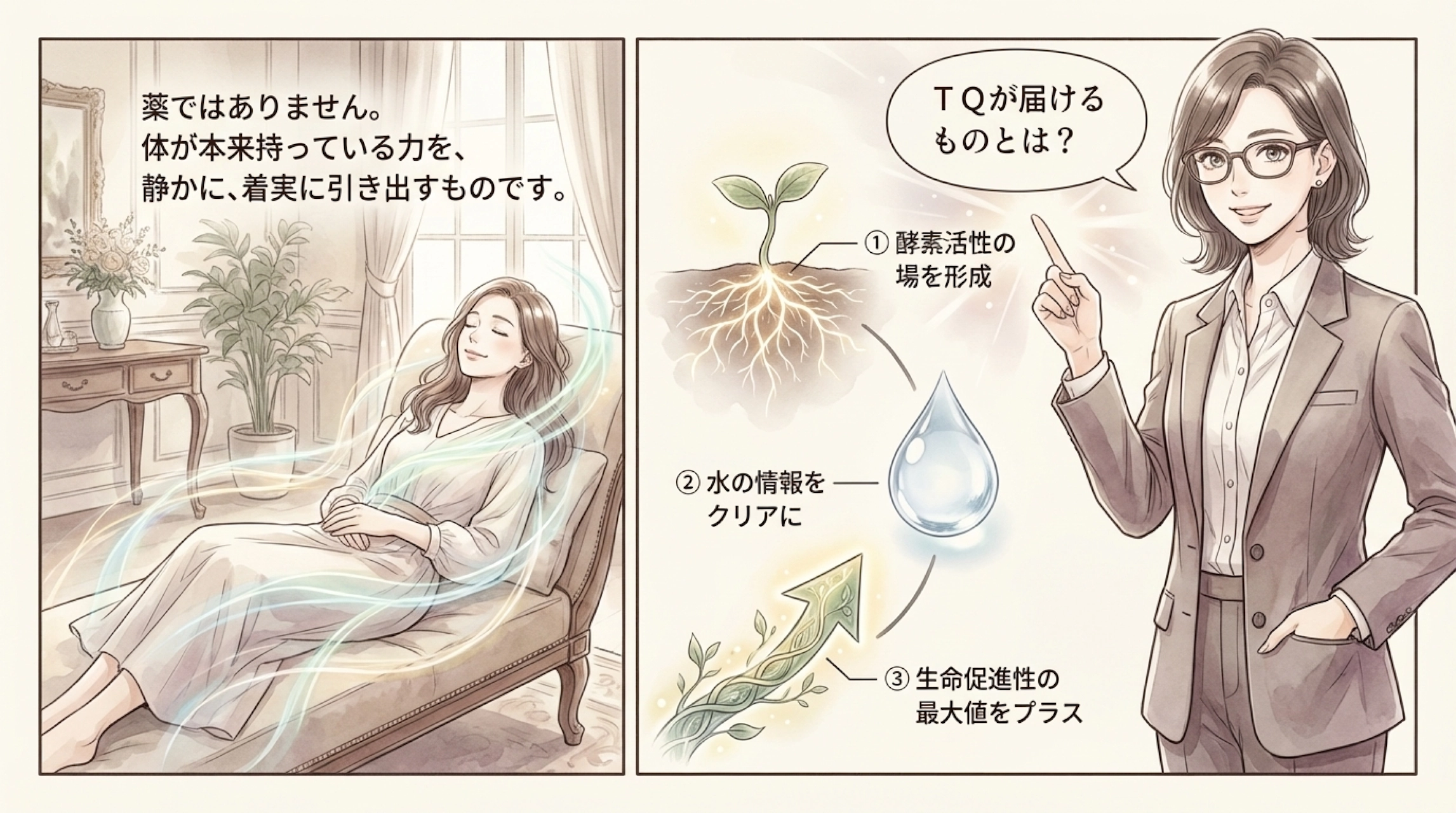 TQは、酵素活性の場を形成し、水の情報をクリアにし、生命促進性の最大値をプラスします。