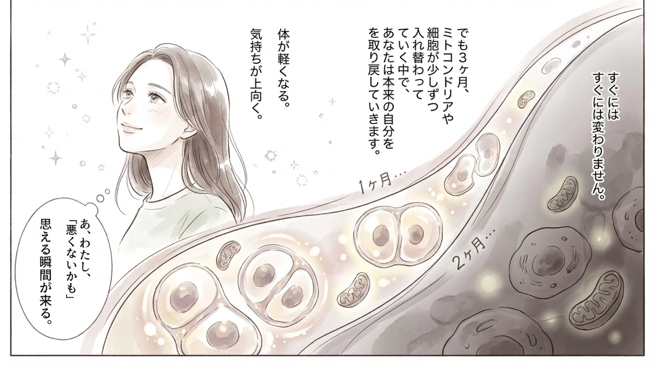 でも3ヶ月、ミトコンドリアや細胞が少しずつ入れ替わっていく中で、あなたは本来の自分を取り戻していきます。